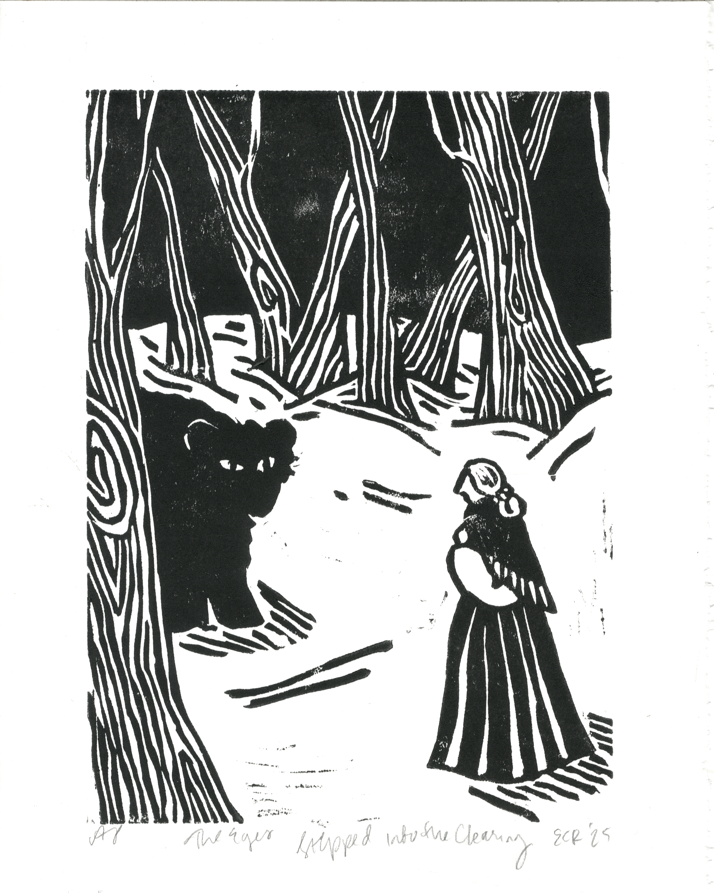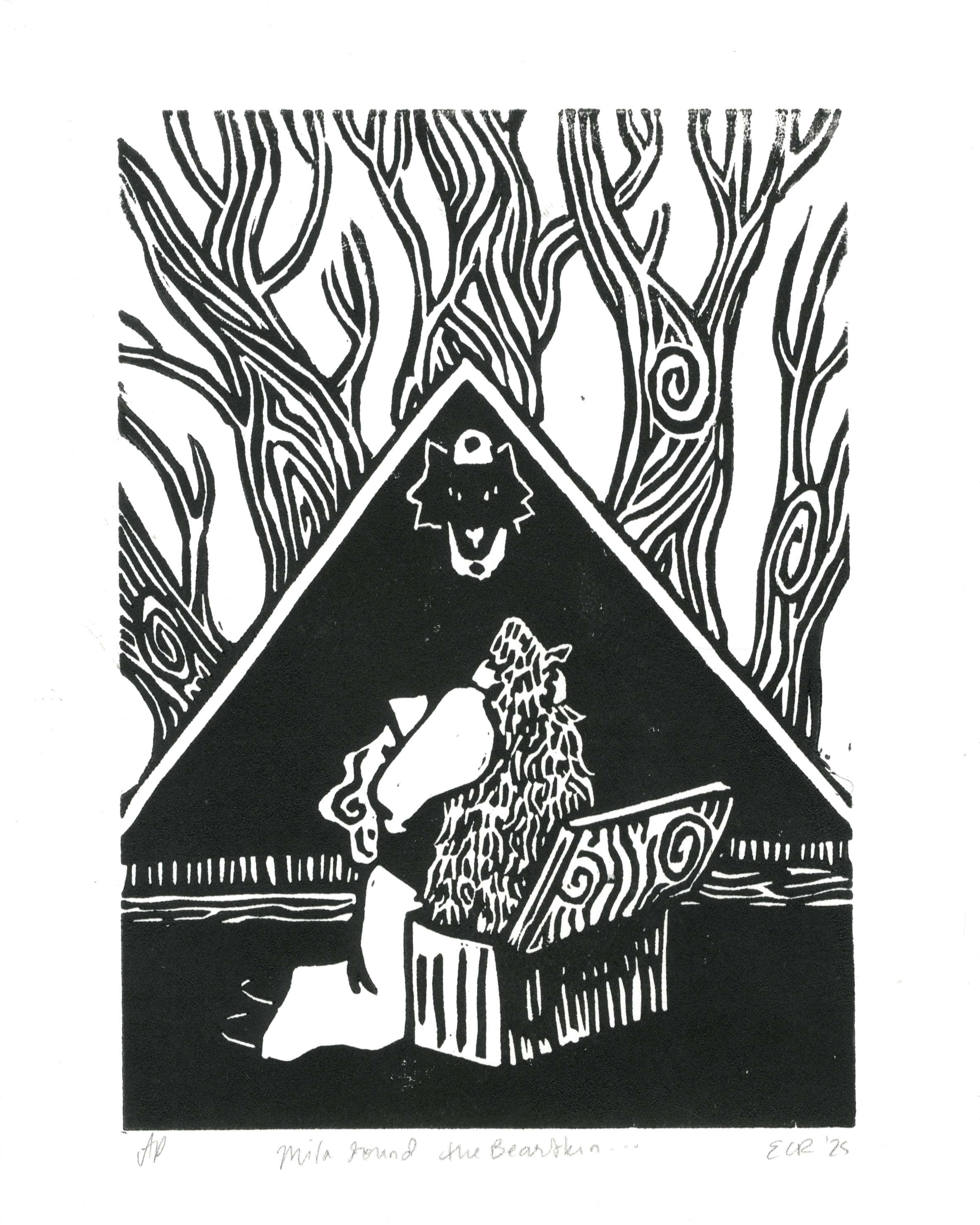 01/23/2026: Hi everyone!! I came back to neocities after AGES away because I wanted to leave a little note about this story and say I've been reworking it a lot with a lot of different ideas in mind for my senior project at college :) I'm on my third draft right now and when I finish the semester or something I'll put it all up but it's kind of a pain to add writing in here...but in my second draft I changed the ending crazy style and I'm not really sure how the third draft is going to end yet. All I can say for certain right now is I'm trying to imbue this third draft with a lot of feelings of loneliness and being out of place because those are themes that have consumed me significantly for the past two years. I also am trying to make it a little stranger and darker because (this is a sentence that everyone at my school is probably sick of hearing) I read The Bloody Chamber last summer and the story "The Werewolf" in it really infected me....But anyway that is not ACTUALLY my project at all! My project is actually making a series of linocut prints to illustrate Bearskin and so I'm going to upload those all up here above the old first draft. I've only got four done; hopefully I'll finish my draft this weekend (if we don't lose internet due to the snowstorm that's going to affect more than half of the US -- my college is in a really rural area) and then I'll get working on the second four. At the end of the project I want to bind it all into a little book :) But I just wanted to put this update up here because this is the only one of my stories that has actually gotten any engagement (as little as it is) so I thought maybe some people would want to know :) I'm not super thrilled with leaving this 1st draft up to be honest...but I don't love the 2nd one either and the 3rd one isn't done. SO! That's the situation. And hopefully I'll have it up for you by sometime in May! And maybe I'll include photos of the book too :) I want to do some fancy drop caps for the printed version as well. We will see what happens!!!! And have a great 2026!